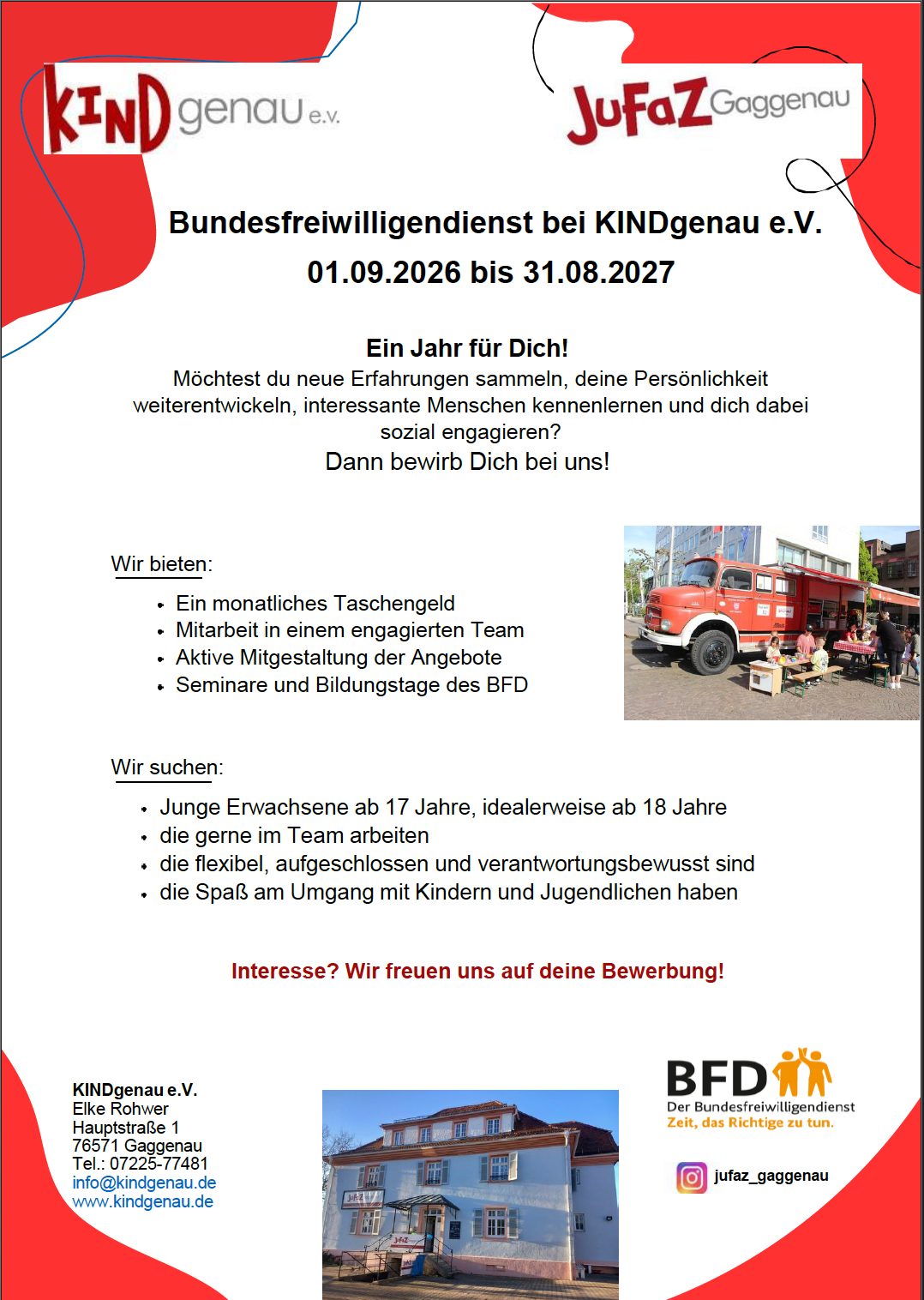 Wir von KINDgenau e.V. in Gaggenau suchen zwei neue Bufdi’s ab 18 Jahren für den Zeitraum von September 2025 bis September 2026!